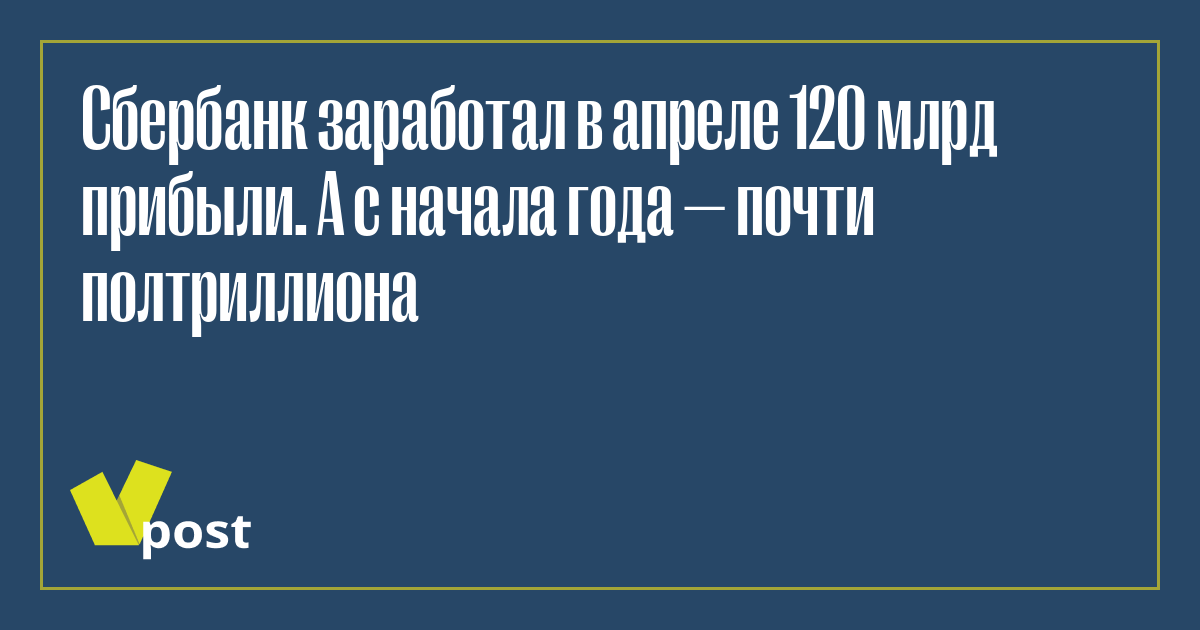 «В апреле Сбер заработал прибыль по РСБУ 120,7 млрд руб., рентабельность капитала составила 24%. Корпоративный и розничный портфели выросли за месяц более чем на 2%. Ипотечный портфель превысил 8 трлн руб., а выдачи ипотечных кредитов находятся на рекордных уровнях — 337 млрд руб.», — приводятся в сообщении госбанка слова предправления Германа Грефа. Банк зарабатывает примерно столько каждый месяц (125 млрд руб. в марте), с начала года его чистая прибыль составила 470 млрд руб.